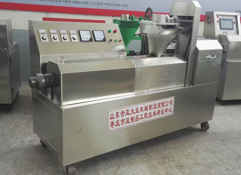本机采用全不锈钢包装,温度是数显自动控温,加温或降温均有信号灯显示,电流电压大小开机均有显示,自动喂粉可以调速,传动部分是本厂生产的豆制品机械专用减速机,电机架是钢板可调型,机器底部用的高档跑轮,便于移动,冷却部分是自动循环水装置,底部设有大容量的储水箱,加温部分是保温节能型,正常生产可节约用电量的30%,其实用电费和烧煤基本持平。本机是一机多用,可通过不同模具筒生产多种花样的食品,如:素牛排、素鸡翅、素海螺、素肉条、素鸡脯肉、素肉丁、豆虾、豆肠、豆丝、豆花、豆筋等十多种产品,如用户需要其它新花样,可来我厂进行加工制作。 生产出来的产品可炒、烹、炖、炸、凉拌,还可用作麻辣小食品原料。 本机特点:美观、大方、卫生、节能、豪华、具有人性化。  |